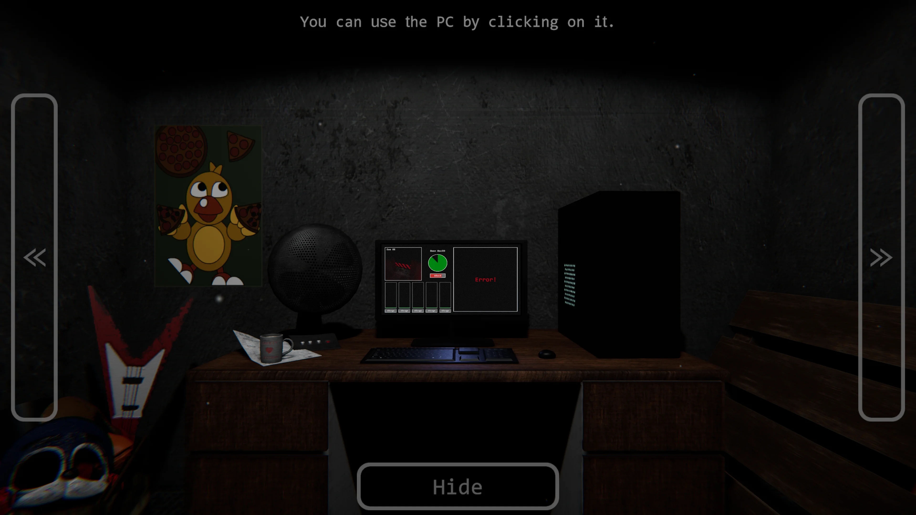 Your first night starts at a security desk with a computer that charges the warehouse's batteries. You need to hold down a button to keep the charge going while monitoring hallways for Freddy — flash your light at him to scare him off. Foxy attacks from the side doors, forcing you to hide. Meanwhile, the main exit door has a health bar that ticks down if you're not careful. Juggling battery charging, lights, ventilation, and door management sets the tone for the rest of the game.